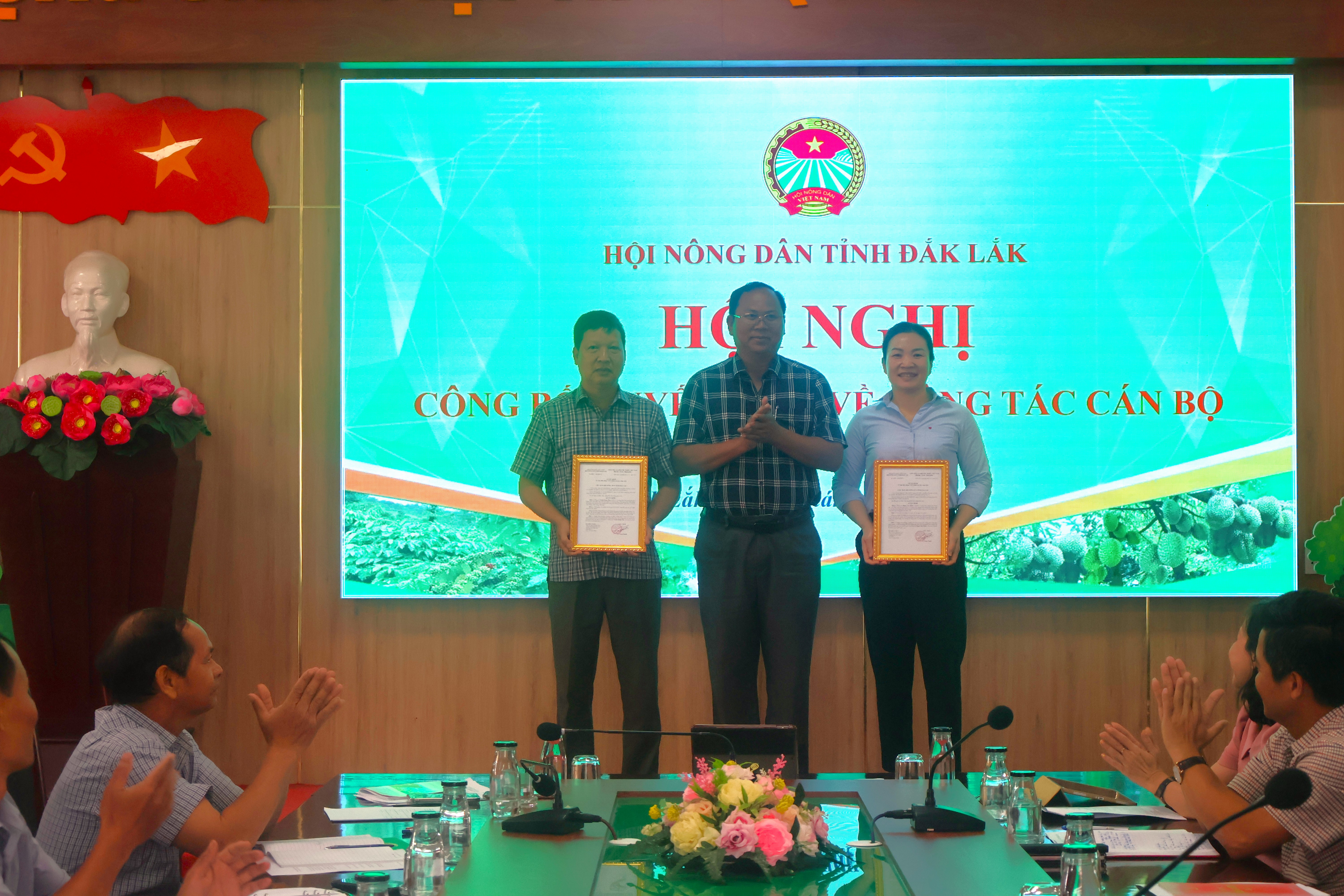 Đồng chí Ya Toan Ênuôl, Chủ tịch Hội Nông dân tỉnh trao quyết định bboor nhiệm cán bộ cho 02 đồng chí Phạm Thị Thêm và Trịnh Xuân Phú.